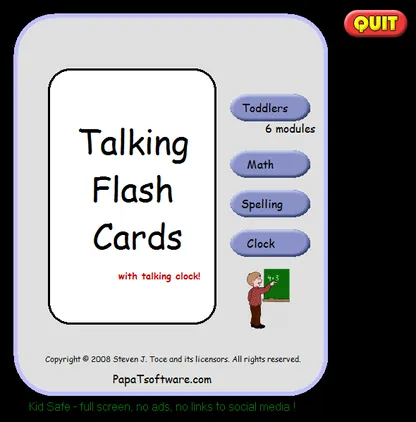 Talking Flashcards aims to improve math, spelling, time-telling, and toddler basics with visual and audio tools. Its simple navigation and a variety of options allow this program to be a favorite of parents and kids.